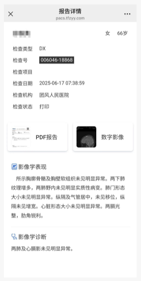即日起,团风县人民医院“云影像”服务覆盖全县各级医疗机构。患者完成X光、CT、磁共振等检查后,无需排队领取实体胶片,通过手机登录“健康团风”公众号即可随时调阅原始高清影像,彻底解决传统胶片“携带难、易损坏、保存短”的痛点。